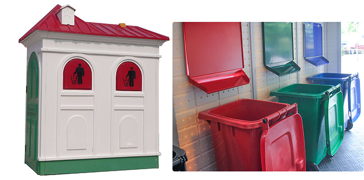 达成双桶垃圾屋外表设计美观,全封闭式结构,垃圾和气味不会外溢,不会对环境造成二次污染,不仅使用 方便,而且极易清扫垃圾屋中垃圾,减轻环卫工人劳动强度;屋身和垃圾箱坚固耐用,抗腐蚀和抗氧化性能优异。